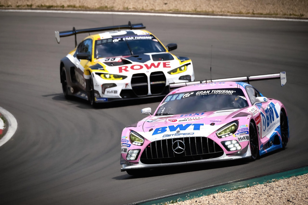 Na pierwszym planie jest Mercedes-AMG GT3 w charakterystycznym różowo-niebieskim malowaniu zespołu BWT. Ma niską sylwetkę, duży grill i szerokie nadwozie – zaprojektowany pod maksymalną aerodynamikę i przyczepność.